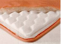 | クッション性や快適支持性を向上させるために、敷きふとんの詰めものの間に固わたをはさみこむことがあります。固わたとはふとん用のわたに熱を加えたり、樹脂を吹き付け圧縮して固くし、厚さを均一に成形したわたのことです。 素材はポリエステルや羊毛、これらを混合したもの、ウレタンなどがあり、固さや構造にもいくつかの種類があります。 |